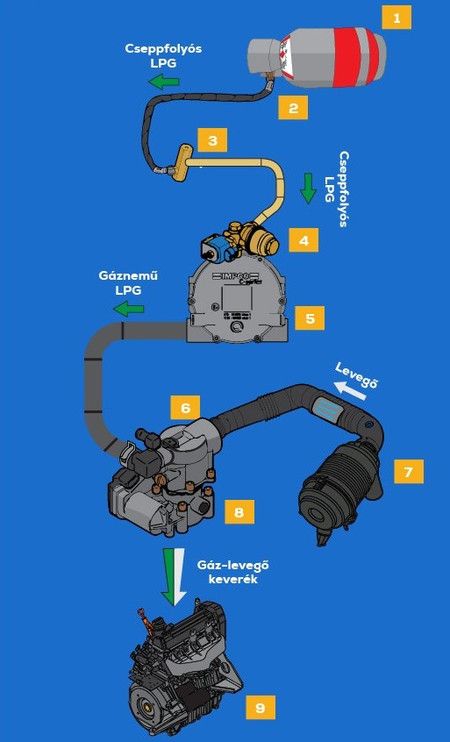 A tartályból kinyert LPG nyomáscsökkentéssel és párologtatással gáz halmazállapotúvá válik, majd a motorba jut, ahol a gyújtáskor elég, így nyomást hoz létre, amely a dugattyú mozgását okozza → ebből lesz a mechanikai és végül a mozgási energia.