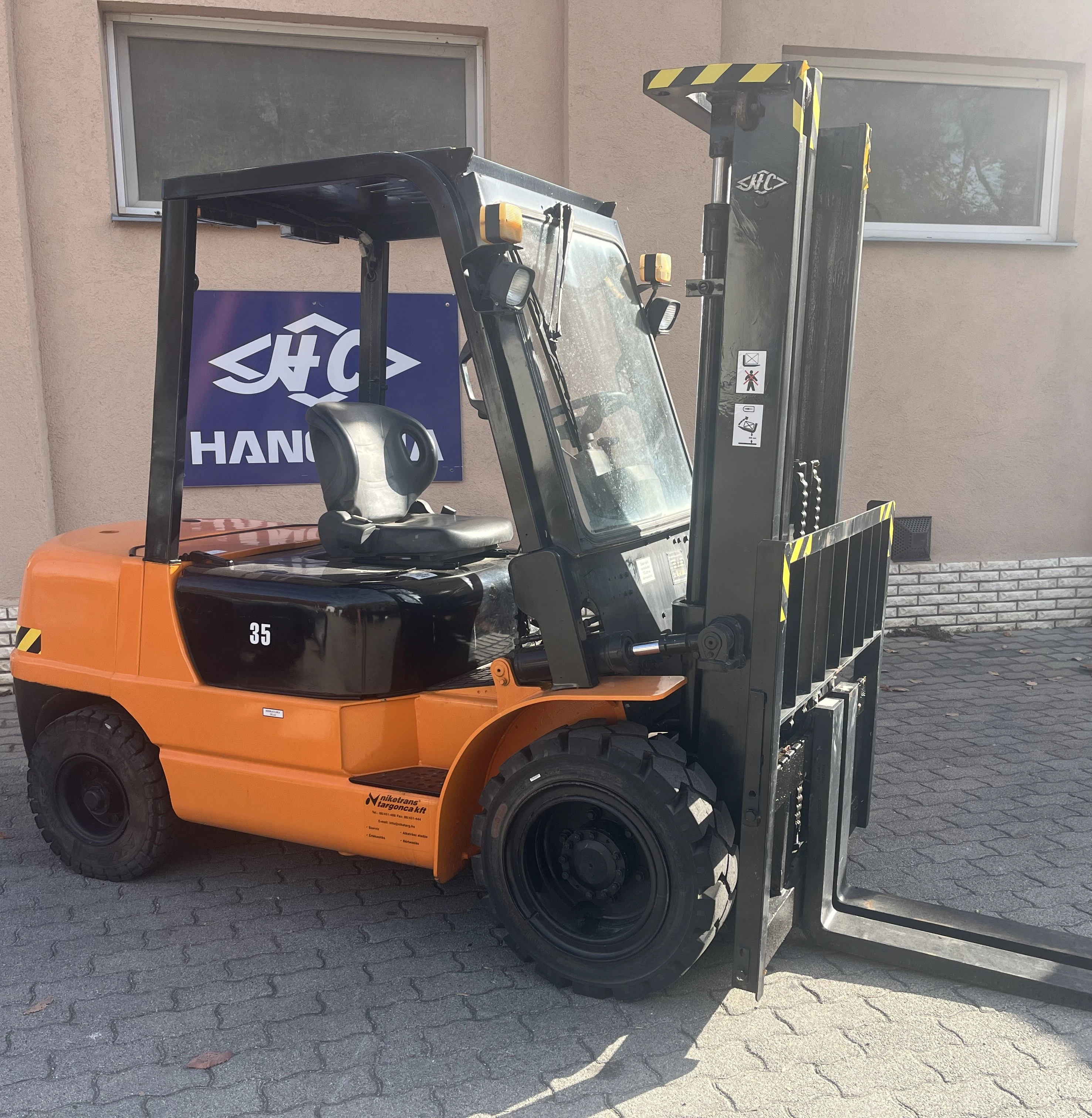Eladásra kínálunk egy használt 3.5 t teherbírású, 2005-ös évjáratú felújított HANGCHA CPCD35 dízel üzemű homlokvillás targoncát, melyre 6 hónap vagy 250 üzemóra garanciát vállalunk.