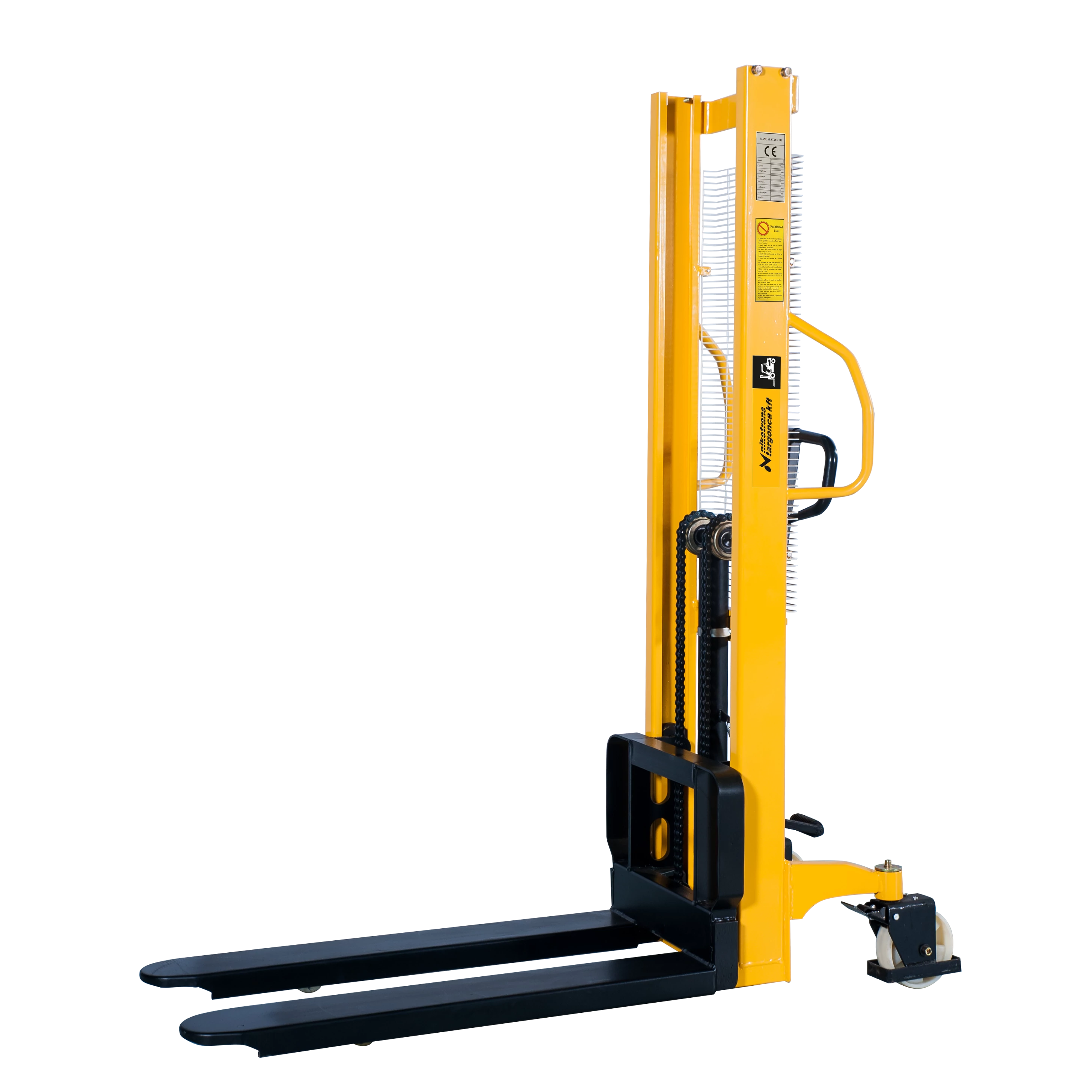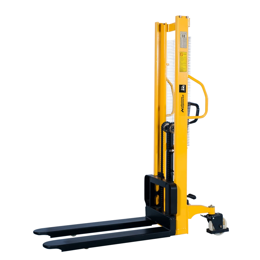 A STAXX 1,5 tonna teherbírású magasemelésű kézi raklapemelő kiválóan alkalmas 1500 kg-nál nem nehezebb raklapos áruk felpakolásához 1600 mm-es magasságig. A STAXX kézi hidraulikus magasemelésű raklapemelő egy hidraulikus rendszerből, toronyból és villából áll. Ez az raklapemlő kézi hidraulikus pumpálható karral húzza fel a súlyt, és kézi erővel szállítja a terheket. A berendezés szpill szeleppel (spill valve) van felszerelve, hogy szabályozza a villa ereszkedés sebességét és biztosítsa a hidraulikus mechanika pontos és megbízható működését. A keret kiváló minőségű sajtolt blokkból van hegesztve. A hátsó kerekek fékezhető görgőkkel vannak ellátva, melyek szabadon és könnyen fordulnak. Az első és hátsó görgők golyóscsapággyal illeszkednek a keréktengelyhez. A kerkek és görgők nylonból készülnek, melyek nagy kopásááóságúak és nem hagynak nyomot a műgyanta padlókon sem. A kormányzást a váz 2 oldalára rögzített foganytúk könnyítik meg. A teher emelése kétféle módon történhet. Az egyszerűbb és gyorsabb mód, amikor a hidraulika henger melletti lábpedál ismételt lenyomásával nagyobb lökettel emeljük fel a terhet. Másik lehetőség az irányítókarral történő felemelés, mely kisebb lökettel emel. Raklepemlőinket összeszerelve és súlypróbával letesztelve adjuk át. Garanciális javítás esetében a javítást cégünk telephelyére beszállítva lehet igénybe venni.