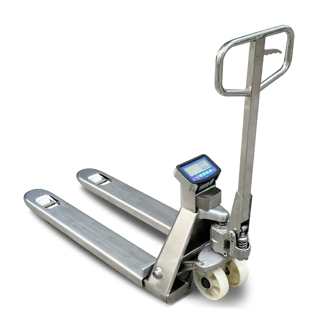 A STAXX rozsdamentes mérleges raklapemelő egy ipari felhasználásra tervezett, multifunkcionális berendezés, amely egyesíti a raklapmozgatás és a precíziós mérés funkcióit, így különösen alkalmas olyan környezetekben, ahol a higiénia, a korrózióállóság és a pontos súlymérés kiemelten fontos például élelmiszerfeldolgozó üzemekben, gyógyszeripari és vegyipari létesítményekben. A teljes szerkezet kiváló minőségű rozsdamentes acélból készül, amely ellenáll a nedvességnek és a korrozív anyagoknak, miközben sima felületének köszönhetően könnyen tisztítható és megfelel a szigorú higiéniai előírásoknak. A beépített mérőrendszer nagy pontosságú mérést biztosít ± 500 g hibahatárral, valós idejű súlymegjelenítéssel, négy precíziós mérőcellával, valamint kg és lb mértékegységek támogatásával és opcionális összegző funkcióval.
